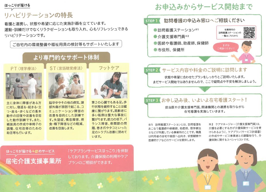 自宅で療養される方が安心して療養生活を送れるように、主治医の指示により当事業所の看護師が定期的に訪問し、必要な処置・看護ケアを行い在宅療養の援助を行います。